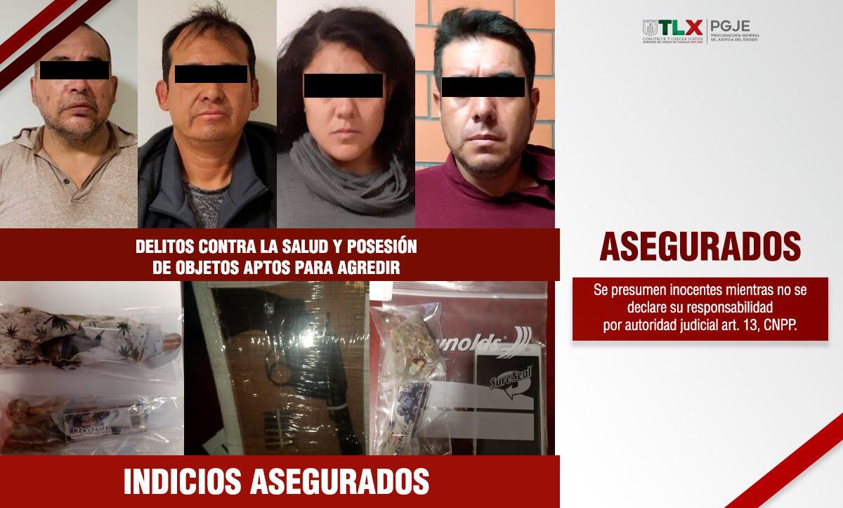 Resultado de los operativos de seguridad, vigilancia e inhibición del delito implementados por la Policía de Investigación adscrita a la Procuraduría General de Justicia del Estado (PGJE), se logró el aseguramiento de cuatro personas que viajaban a bordo de un vehículo en el que llevaban un arma de fuego y varios envoltorios con droga sintética conocida como cristal y mariguana.