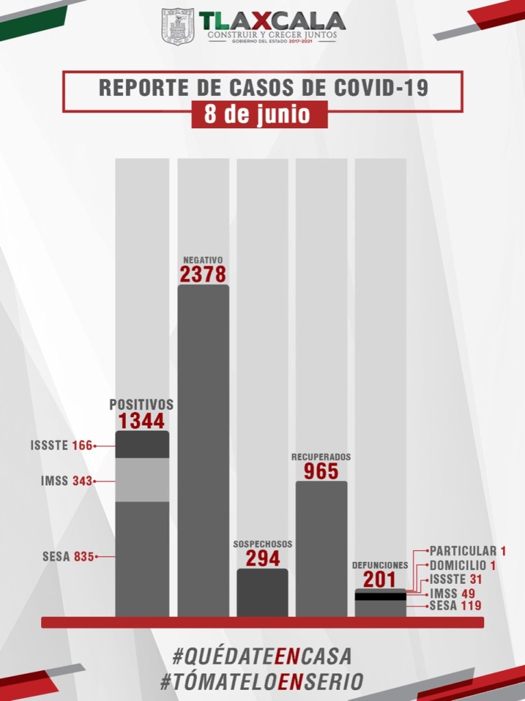De esta manera, la entidad registra 965 personas recuperadas, mil 344 casos positivos y 201 fallecimientos.