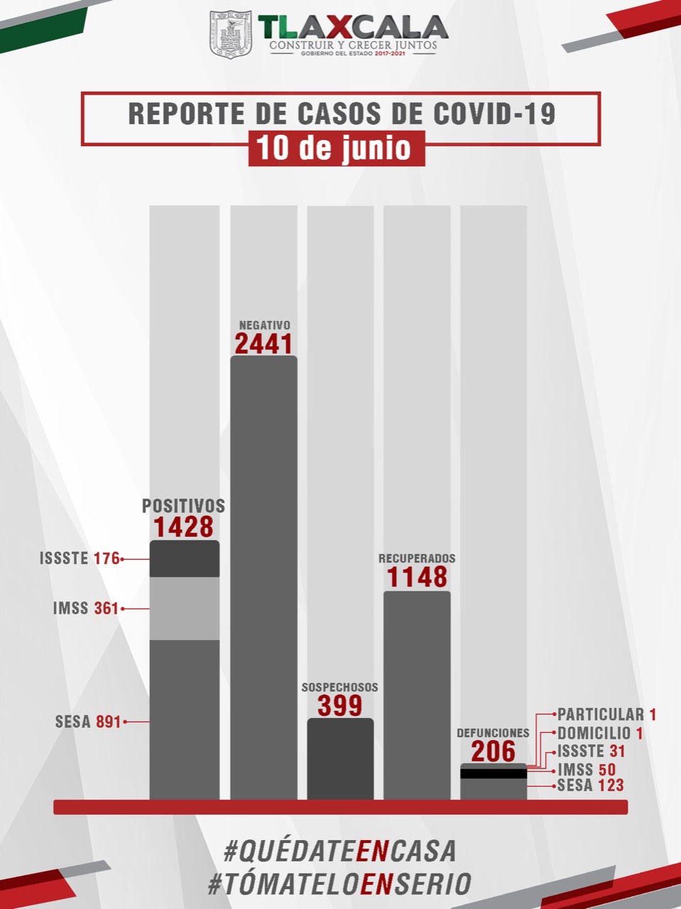 De esta manera, la entidad registra mil 428 casos positivos, mil 148 personas recuperadas y 206 fallecimientos.