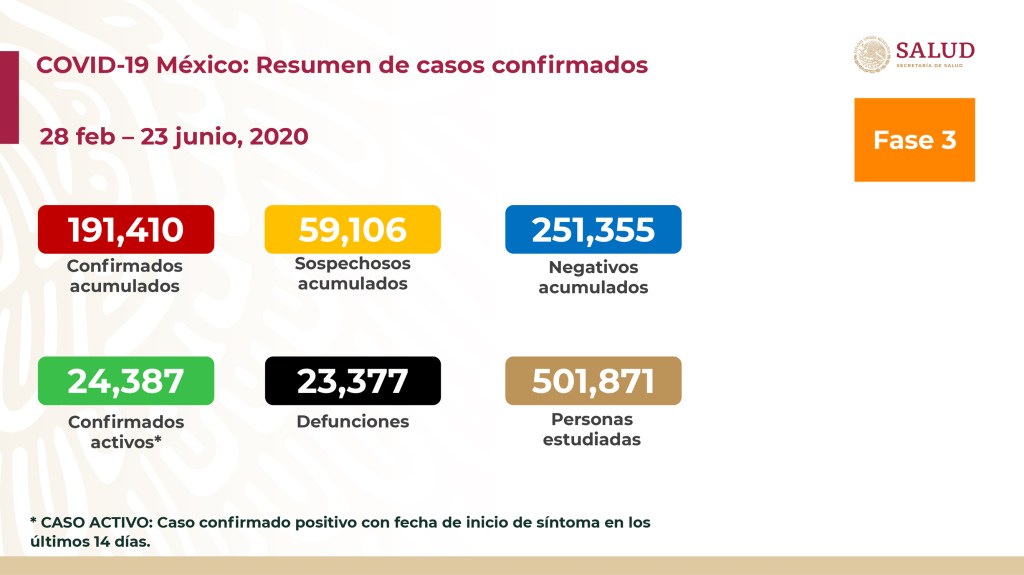 Nuestro país sigue en una etapa de contigencia, en la Fase 3, acorde a la Secretaría de Salud y al Dr. Hugo López Gatell, Subsecretario de Prevención y Promoción de la Salud; Al 23 de junio de 2020 hay 191,410 casos confirmados, 24,387 confirmados activos y 59,106 sospechosos por #COVID19. Se han registrado 251,355 negativos, 23,377 defunciones confirmadas, 1,848 defunciones sospechosas y fueron estudiadas 501,871 personas.