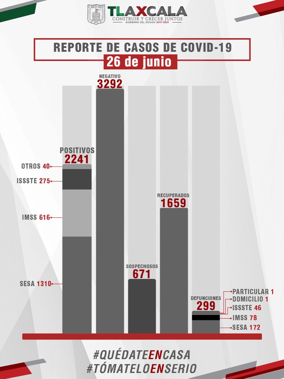 De esta manera, la entidad registra mil 659 personas recuperadas, dos mil 241 casos positivos y 299 fallecimientos.