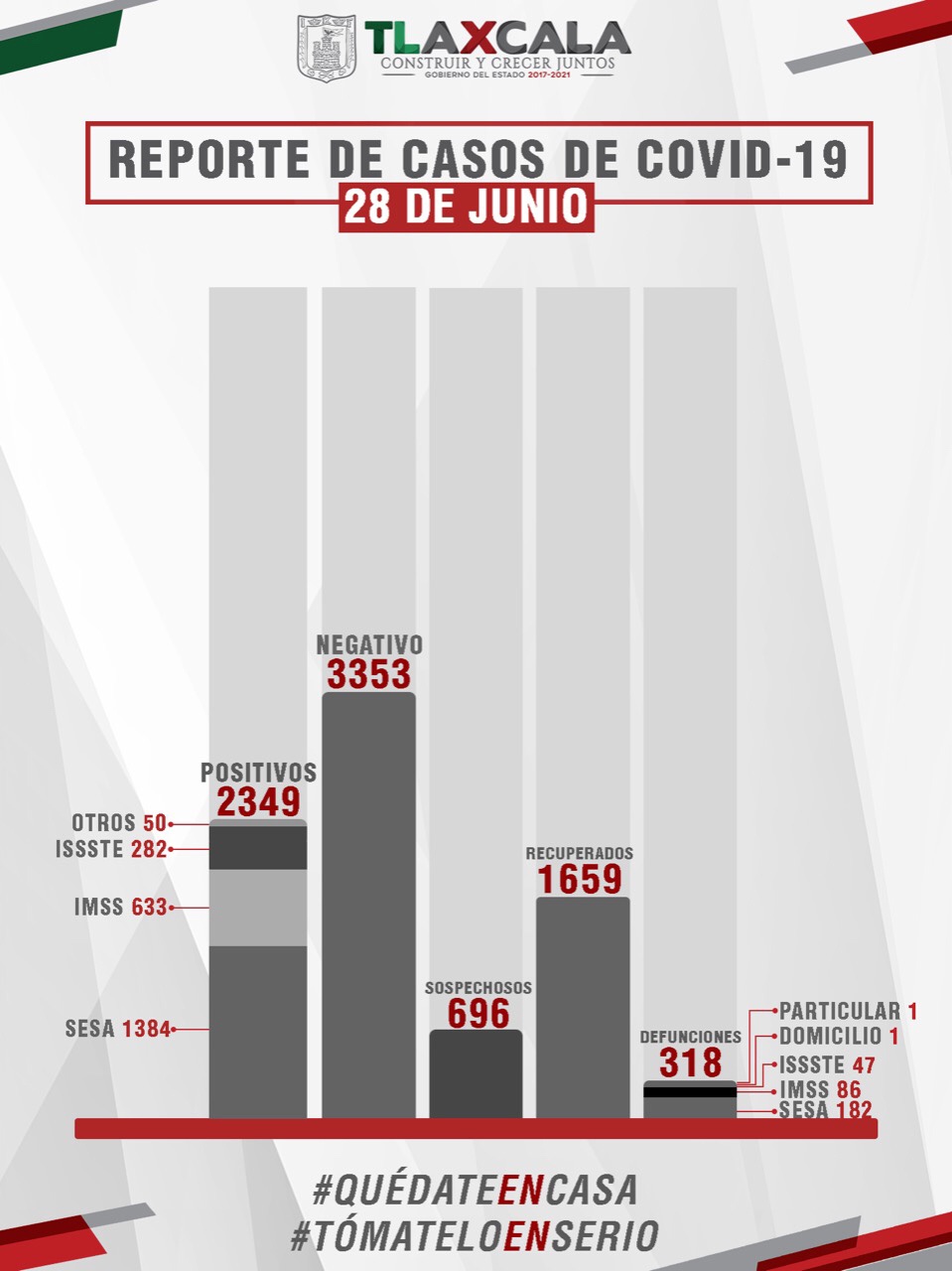 De esta manera, la entidad registra mil 659 personas recuperadas, dos mil 349 casos positivos y 318 fallecimientos.