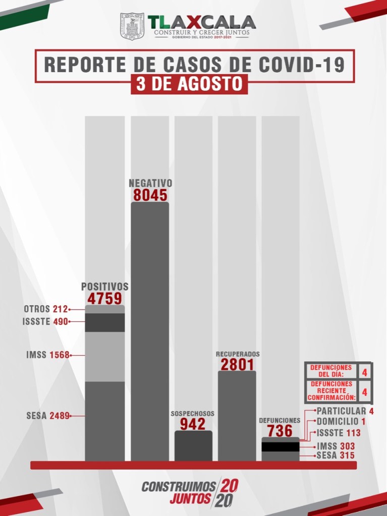 De esta manera, el estado registra dos mil 801 personas recuperadas, cuatro mil 759 casos positivos y 736 fallecimientos.