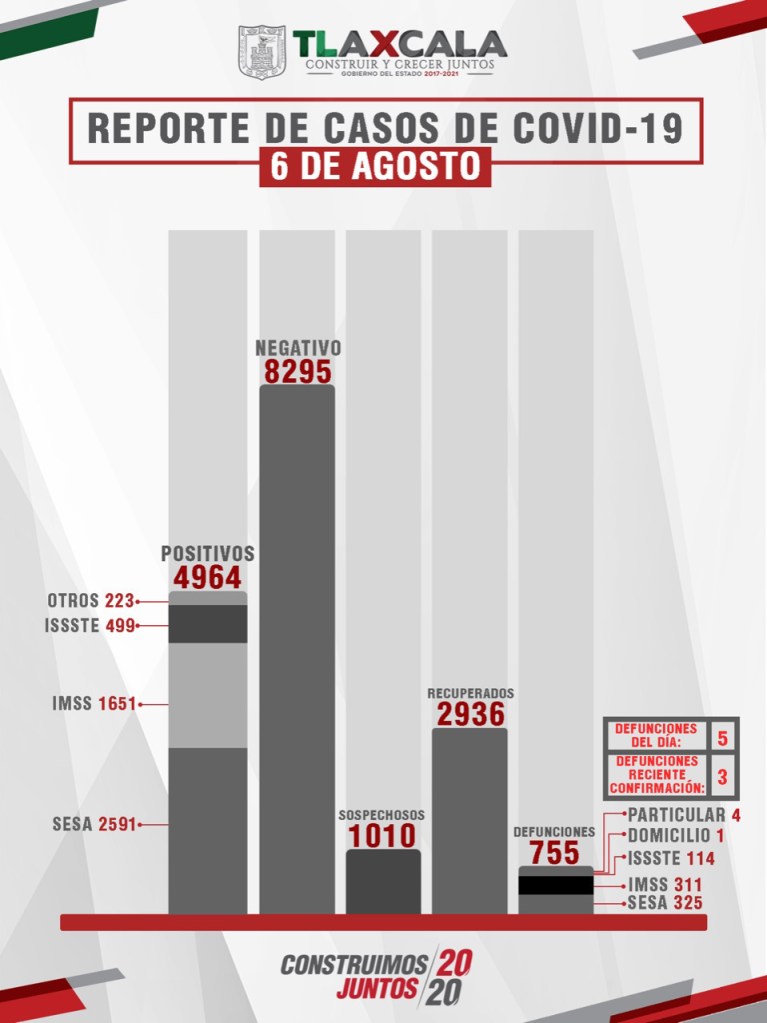 De acuerdo con el reporte de este viernes, la Secretaría de Salud del Estado (SESA) confirmó 41 personas recuperadas, 65 casos positivos más y 5 fallecimientos de Covid-19 en Tlaxcala.