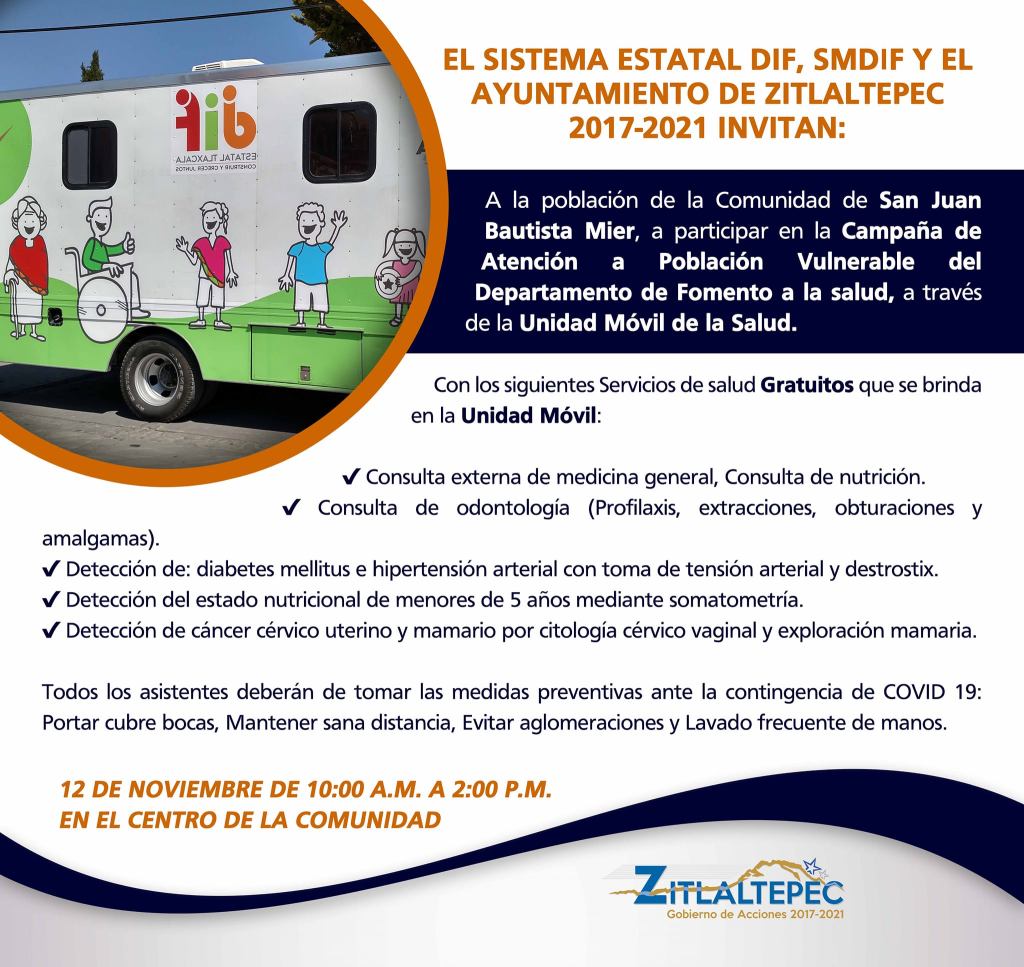 El sistema Estatal DIF, y el Sistema municipal invitan a la población de la Comunidad de Javier Mina, a que este 12 de noviembre acuda al centro de comunidad para su atención.