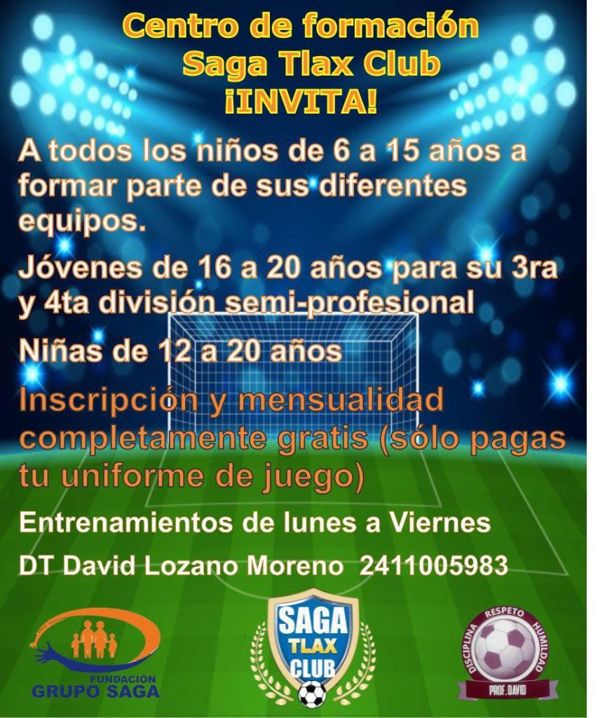 El Profesor David Lozano presidente de Tuzos Saga y DT de los equipos de tercera y cuarta división, en conjunto con la Fundación Grupo SAGA, hacen la invitación a niñas, niños y jóvenes a sumarse al Centro de Formación Futbolística SAGA Tlax Club.