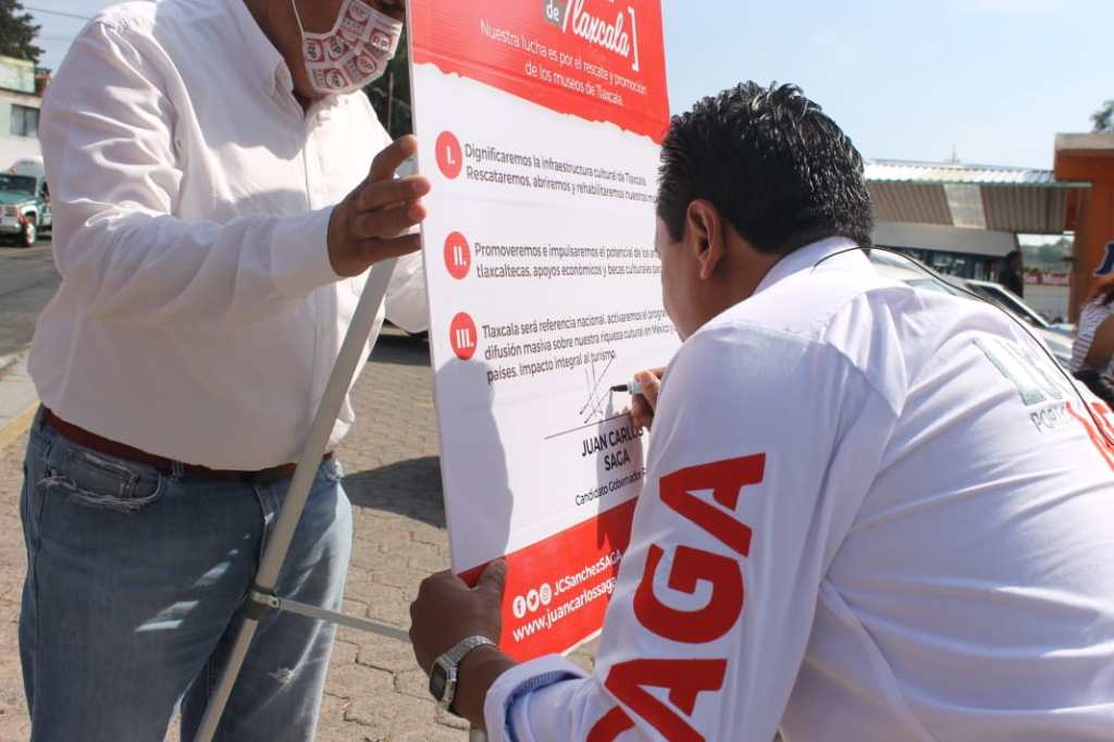 Este jueves el candidato a la gubernatura de Tlaxcala por el partido Redes Sociales Progresistas (RSP), Juan Carlos Sánchez García, SAGA, firmó el tercer compromiso para su gobierno, el cual consiste en rescatar los museos de la entidad, así como impulsar con apoyos a artistas, escultores, músicos, pintores, danzantes, poetas, cineastas y fotógrafos del estado de Tlaxcala.