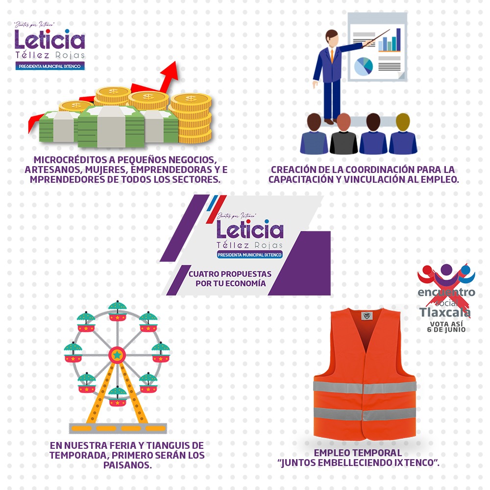 Leticia Téllez Rojas, candidata a la Presidencia Municipal de Ixtenco, por el Partido Encuentro Social Tlaxcala, (PEST) reveló sus 4 compromisos por la economía de los ciudadanos de esa demarcación, en la que destaca el otorgamiento de microcréditos a pequeños negocios, artesanos, mujeres, mujeres emprendoras y emprendores de todos los sectores.