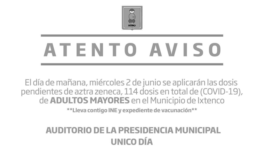 ÚNICODÍA Atención Ixtenco, el día de mañana se continuará con la aplicación de la segunda dosis, de la vacuna AZTRA ZENECA, si fuiste de las 114 personas vacunadas con esta formula, acude el día de mañana al auditorio de la Presidencia Municipal, lleva contigo tu INE expediente de vacunación