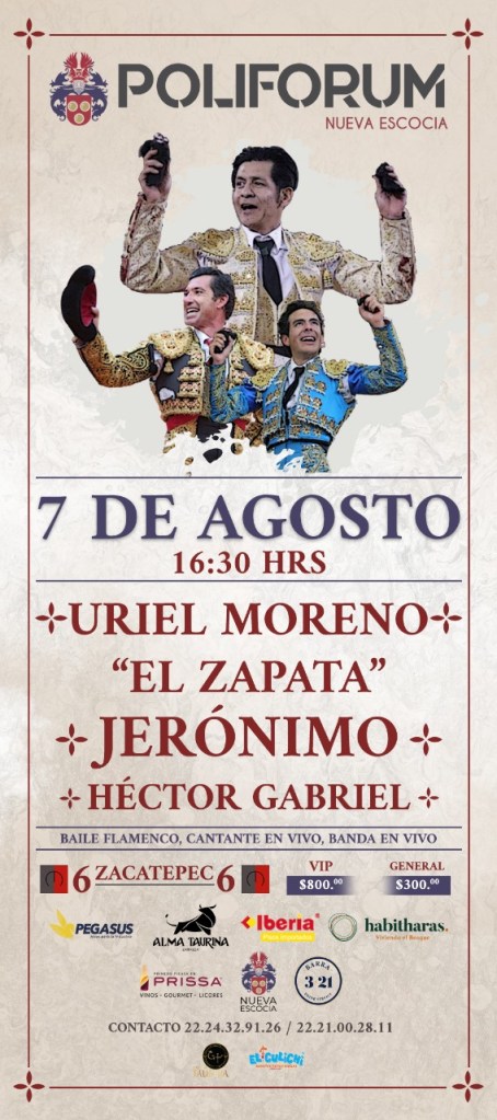 El cartel lo encabeza el matador tlaxcalteca, ídolo de esta afición, Uriel Moreno «El Zapata» y tiene un gran tinte poblano pues lo acompañanJerónimo y Héctor Gabriel para lidiar una bella corrida de Zacatepec.