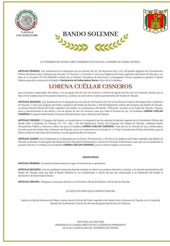 El Pleno de la LXIII Legislatura del Congreso del Estado de Tlaxcala, dio a conocer la declaratoria de Gobernadora electa a favor de Lorena Cuéllar Cisneros, para el periodo comprendido del 31 de agosto de 2020 al 30 de agosto del 2027.