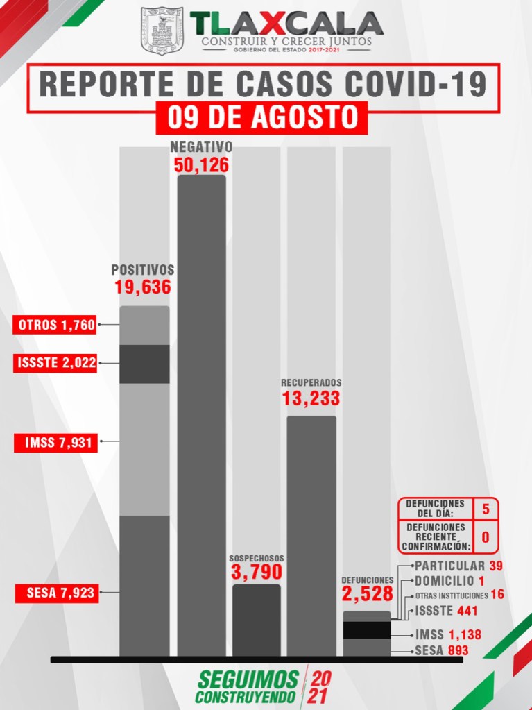 De acuerdo con el reporte del 09 de agosto, la Secretaría de Salud del Estado (SESA) confirmó 32 personas recuperadas, cinco fallecimientos y 84 casos positivos de Covid-19 de tlaxcaltecas identificados en el estado y cinco en otras entidades.