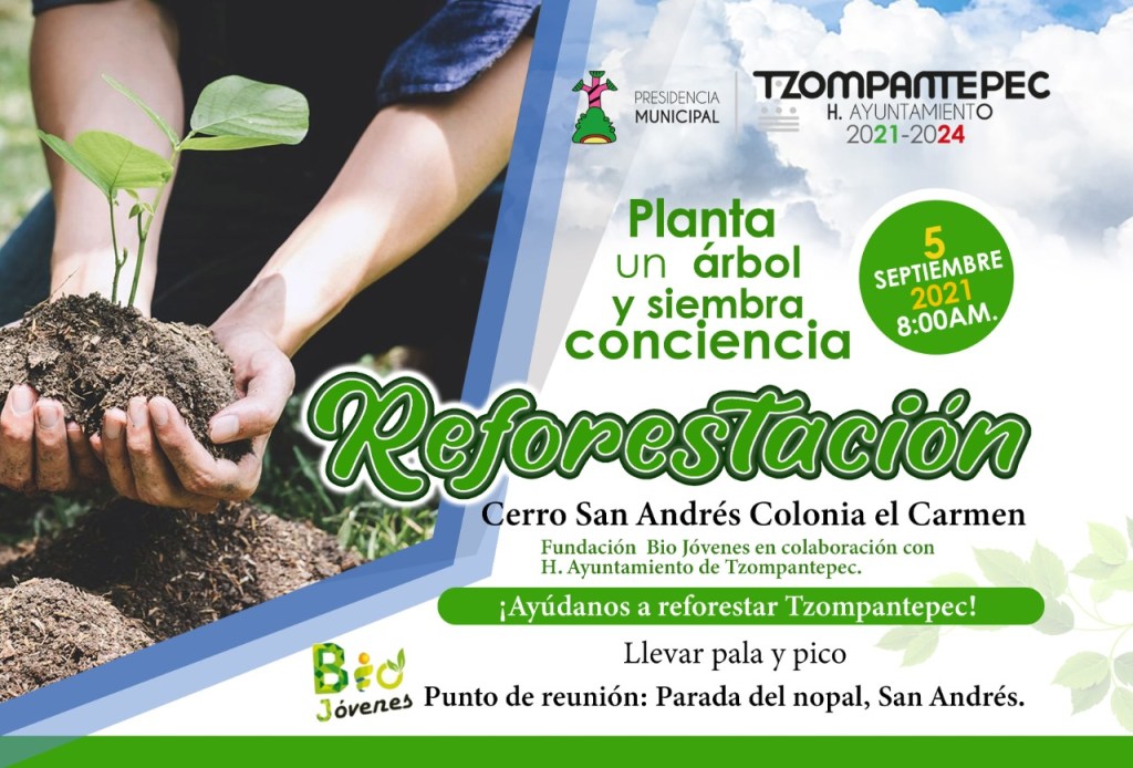 La fundación Bio Jóvenes en colaboración con el H. Gobierno de Tzompantepec encabezado por Manuel Ramos Montiel este domingo 5 de septiembre realizaron labores de reforestación en el Cerro conocido como San Andrés donde más de un centenar de participantes colaboró.