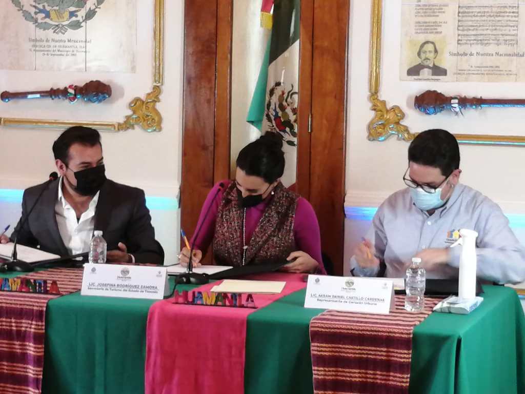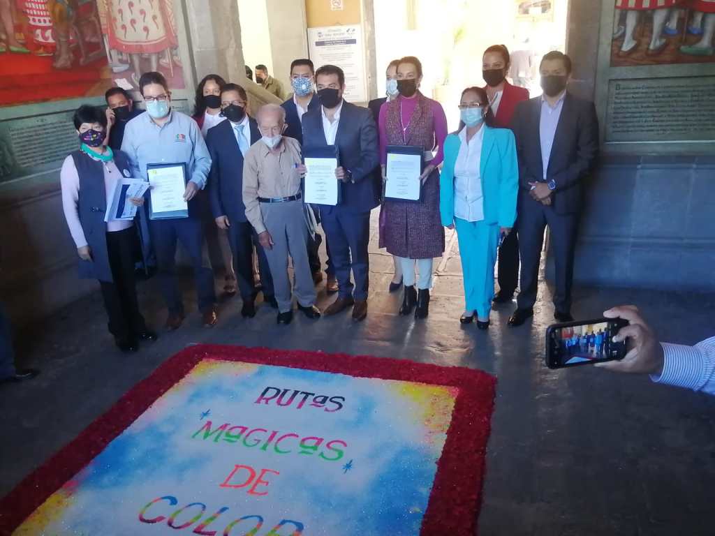 Firman convenio de colaboración “Corazón Urbano y grupo comercial COMEX”, Salvador Santos Cedillo alcalde de Huamanta, y Josefina Rodríguez Zamora del programa “Rutas Mágicas del Color” en la primera etapa se beneficiará a las plazuelas del centro histórico.