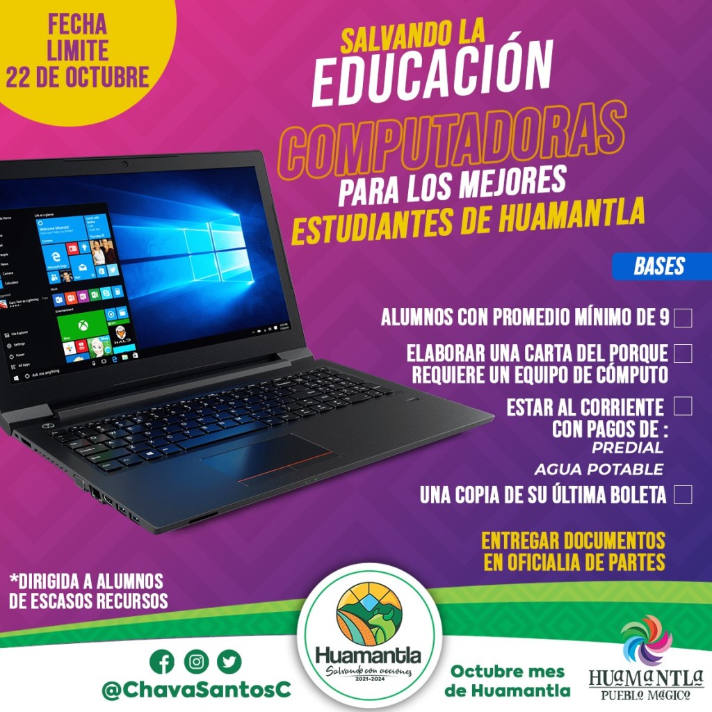 Huamantla, Tlax.- Este viernes 22 de octubre cierra la primera convocatoria para que los jóvenes de nivel preparatoria con los mejores promedios entreguen sus papeles para recibir una computadora totalmente gratis, así lo anunció el Presidente Municipal de Huamantla Salvador Santos Cedillo, quien recordó que estas acciones son en cumplimiento a una promesa de campaña y en la dijo donaría la mitad de su sueldo para este proyecto.