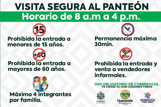 Queda prohibida la entrada a menores de 15 años, así como de personas mayores de 60; el aforo máximo por sepulcro será de 4 personas; la permanencia será con un tiempo máximo de 30 minutos, capacidad al 80 por ciento y quedará prohibida la instalación de vendedores informales tanto al exterior como interior de los panteones.
