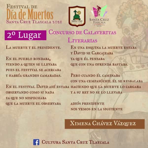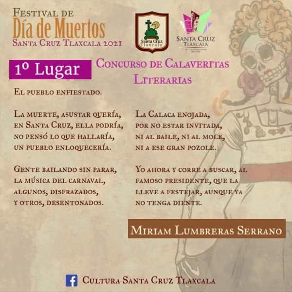 El primer lugar fue para Yael Chamorro Saldaña, el segundo lugar fue para María Luisa Yáñez y tercer lugar a Leonela Cocoletzi, respecto a las calaveritas literarias fue para Miriam Lumbreras Serrano primer lugar con la calaverita titulada “El Pueblo Enfiestado”, el segundo lugar para Ximena Chávez Vázquez con la calaverita titulada “La Muerte y el presidente”, y el Tercer lugar para Paola Sánchez Vázquez, con la calaverita “En Memoria de Víctor Rocha”.
