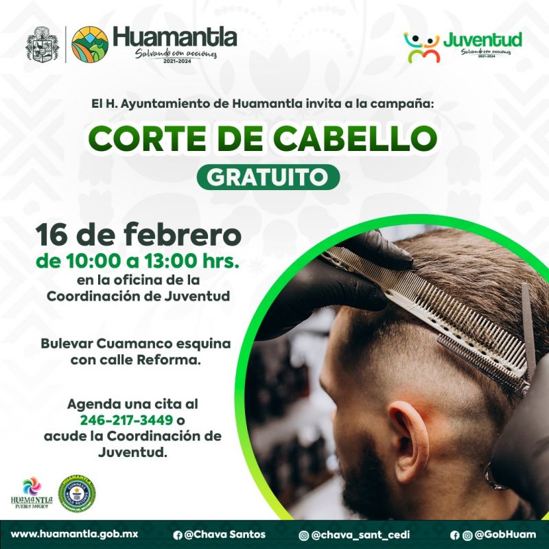 Con el propósito de apoyar la economía de las familias huamantlecas, el H. Ayuntamiento de Huamantla, que preside Salvador Santos Cedillo, a través de la Coordinación de Juventud, llevará a cabo la campaña de corte de cabello gratuito el próximo jueves 16 de febrero.