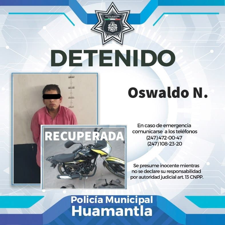Cuando se le da alcance, el piloto se identifica con el nombre de Oswaldo N. de 22 años de edad, al solicitarle hacer una revisión a su persona y al vehículo, se confirma que la motocicleta corresponde a la del reporte de robo.