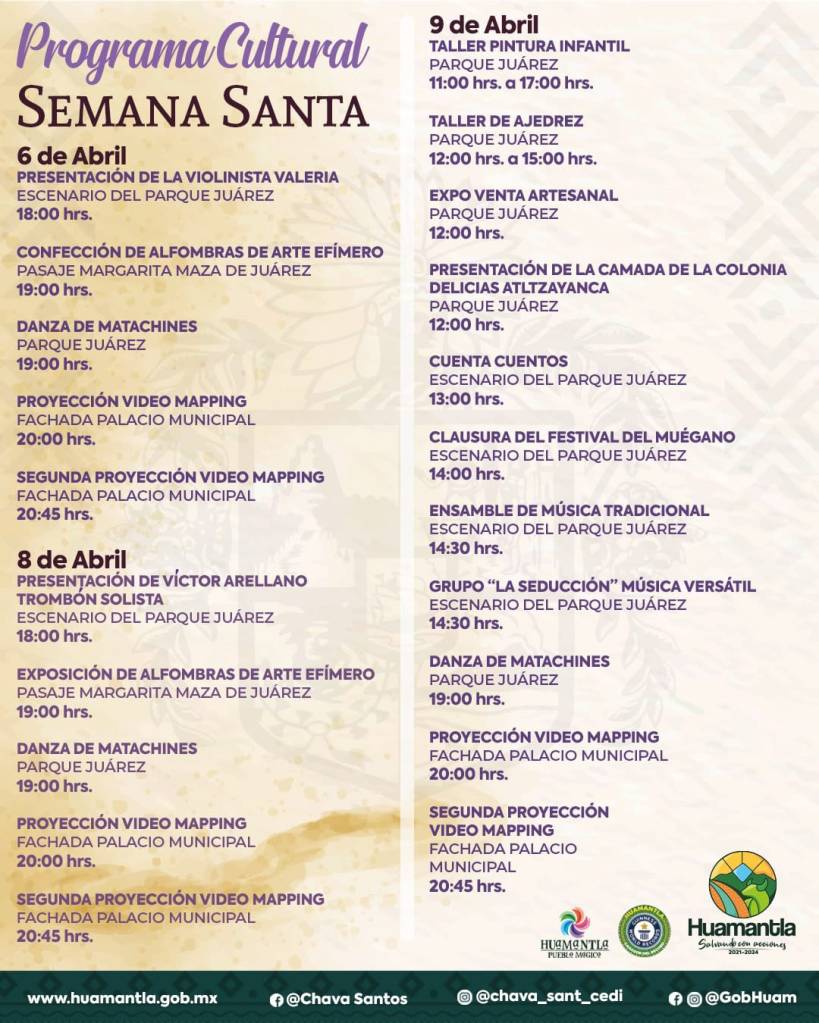 El H. Ayuntamiento de Huamantla a través de la Coordinación de Cultura, invita a toda la ciudadanía a asistir al Programa Cultural de Semana Santa, que tendrá lugar en el Parque Juárez durante estos días donde podrán disfrutar de diversas actividades artísticas y culturales en compañía de la familia.