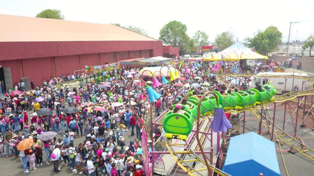 Afuera del Centro Cívico se encontraban los juegos mecánicos donde niñas y niños disfrutaron de las atracciones de manera gratuita; también, los más valientes vivieron momentos de adrenalina en la Mini Huamantlada.