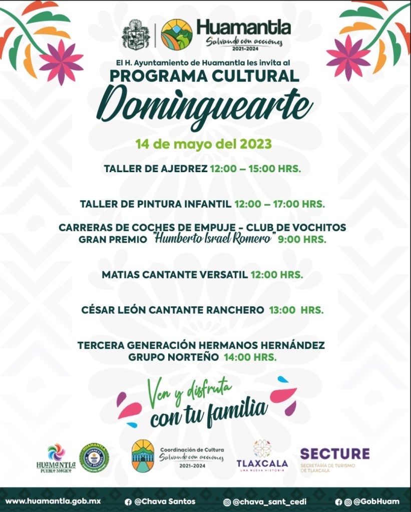 El H. Ayuntamiento de Huamantla que preside Salvador Santos Cedillo, a través de la Coordinación de Cultura, presentarán una cartelera atractiva este 13 de Mayo en el programa “Dominguearte”