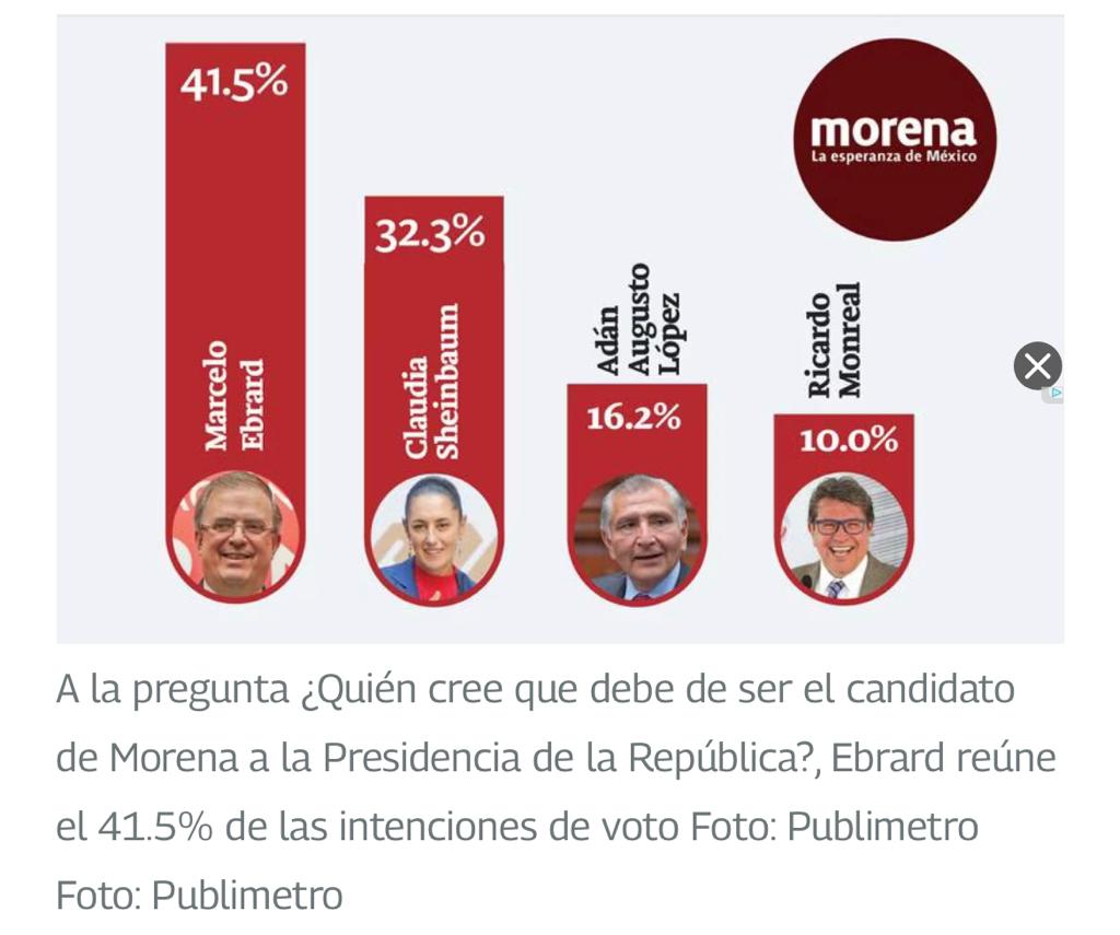 A la pregunta ¿Quién cree que debe de ser el candidato de Morena a la Presidencia de la República?, Ebrard reúne el 41.5% de las intenciones de voto, mientras que la jefa de Gobierno de la Ciudad de México, Claudia Sheinbaum, se ubica en el segundo lugar, con el 32.3% de las preferencias.