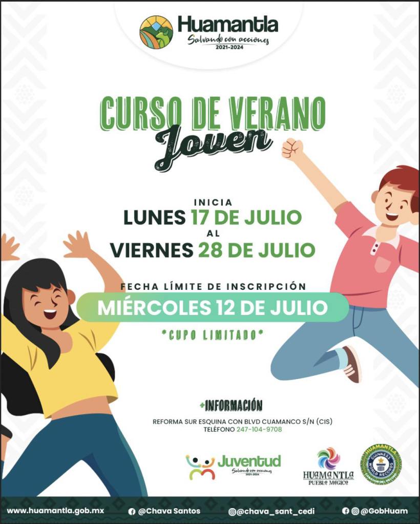El H. Ayuntamiento de Huamantla que preside Salvador Santos Cedillo, a través de la Coordinación de Juventud, invita al Curso de Verano Joven, totalmente gratuito, del 17 al 28 de julio, con actividades recreativas, culturales, deportivas y artísticas.