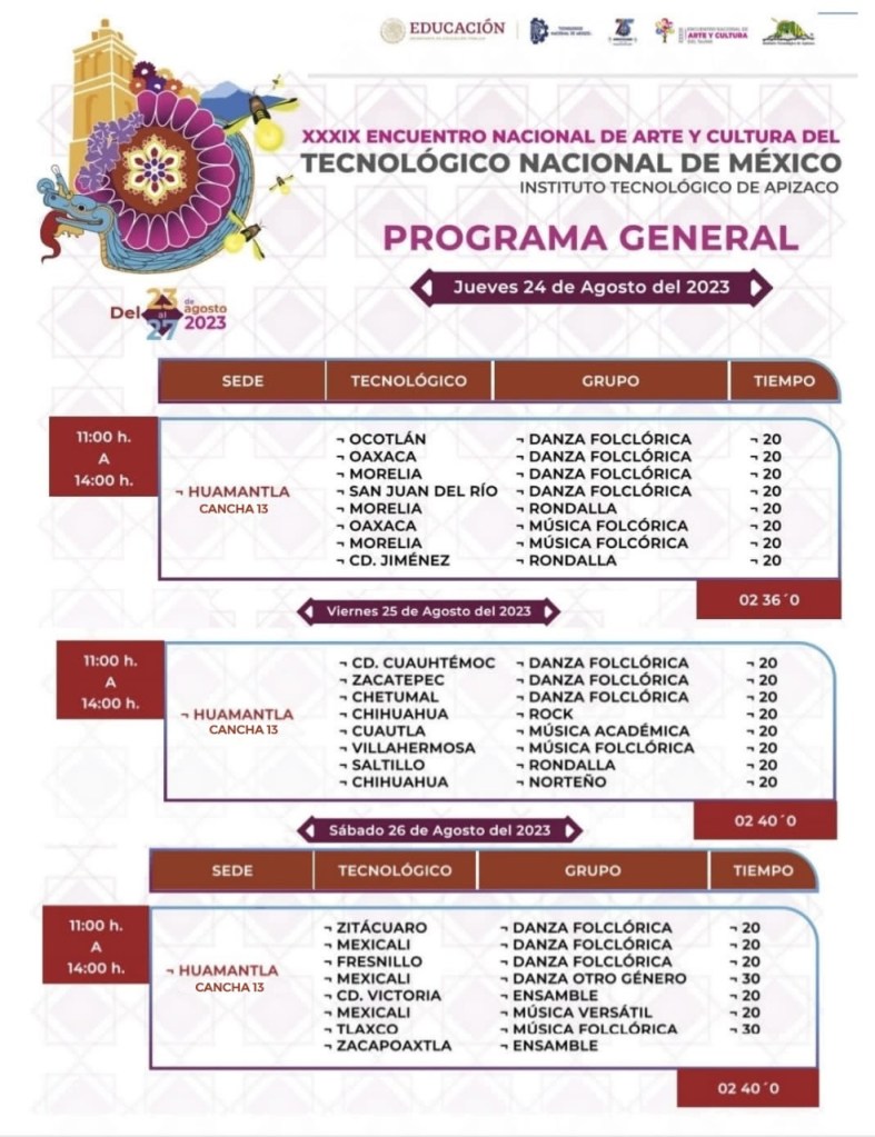 La coordinadora de Cultura del Municipio, Isabel Aquino Romero, mencionó que Huamantla será anfitrión de las expresiones artísticas de los estudiantes en la renovada Ex Cancha 13, a partir de las 11:00 horas los días 24, 25 y 26 de agosto, la entrada es libre.