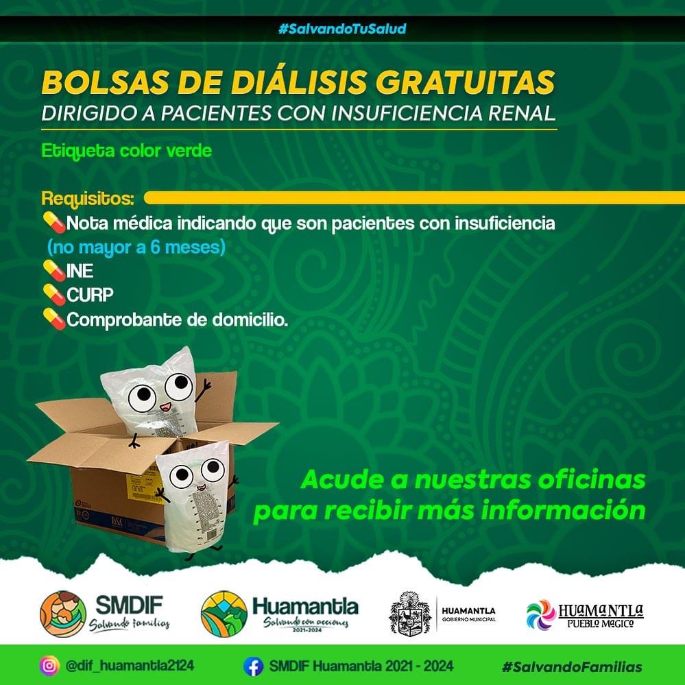 El Sistema Municipal para el Desarrollo Integral de la Familia (SMDIF) de Huamantla, través del programa “Salvando tu salud”, otorga apoyos a personas de escasos recursos económicos, mediante la donación de implementos y medicamentos para pacientes con insuficiencia renal y diabetes, a fin de contribuir en su tratamiento y economía familiar.