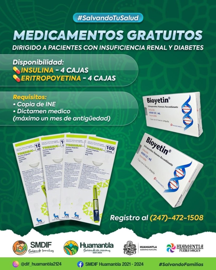 La directora del DIF Municipal, Teresa Ramírez Códiz, informa que se tiene disponibilidad de cajas de insulina y cajas de Eritropoyetina, para quienes lo requieran y acudan con los siguientes requisitos: copia de INE y dictamen médico no mayor a un mes de antigüedad.