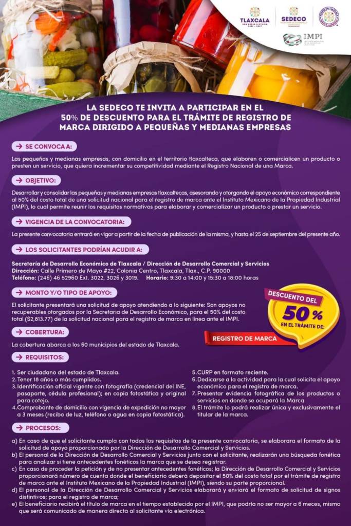 Con el objetivo de desarrollar y consolidar a las pequeñas y medianas empresas del municipio, el gobierno de Huamantla que encabeza Salvador Santos Cedillo, las invita a participar en el programa de descuento para el trámite de registro de marca, que impulsa el gobierno del estado a través de la Secretaría de Desarrollo Económico (Sedeco).