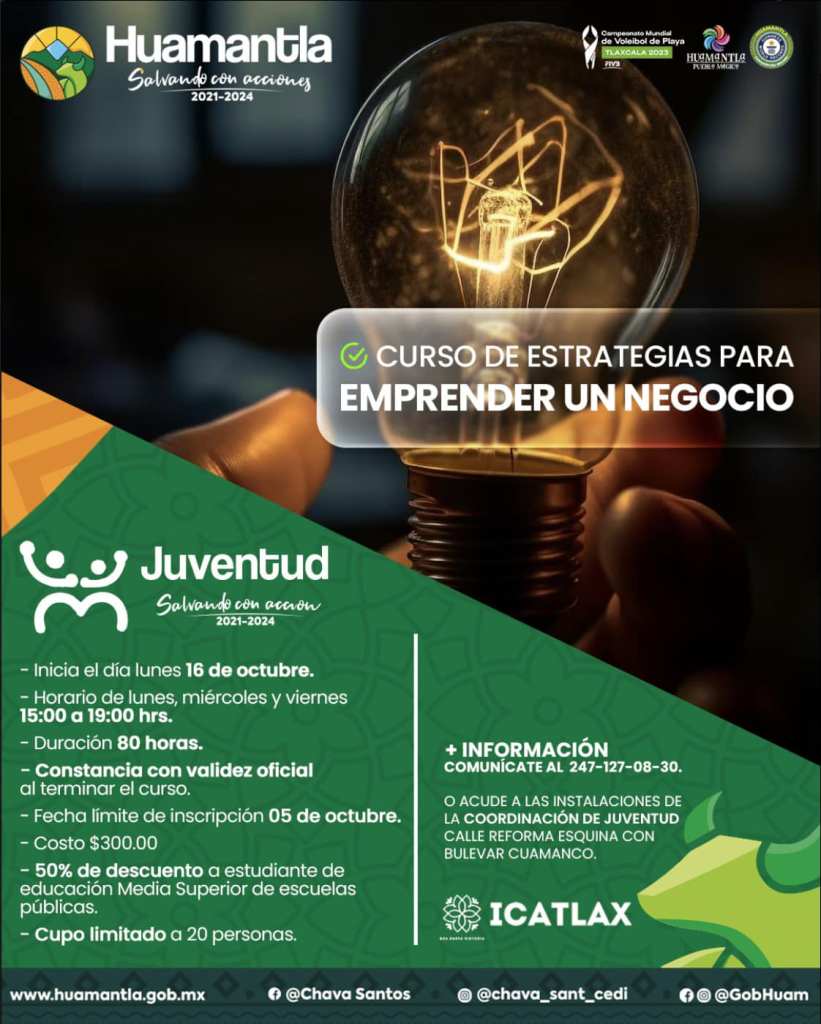 El Gobierno Municipal de Huamantla que encabeza Salvador Santos Cedillo, a través de la Coordinación de Juventud, invita a la población de 15 años en adelante al curso denominado “Estrategias para Emprender un Negocio”, el cual será impartido por especialistas del Instituto de Capacitación para el Trabajo del Estado de Tlaxcala (Icatlax).