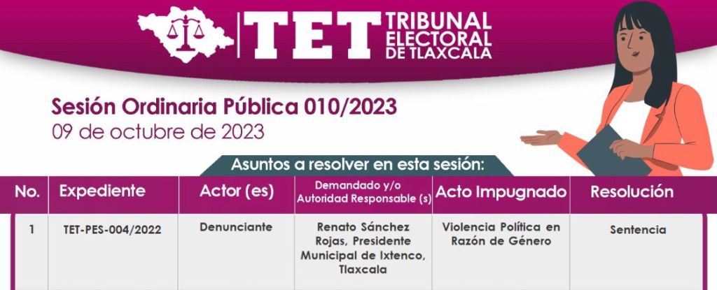 Este día el pleno del Tribunal Electoral de Tlaxcala, dictó sentencia al Presidente Municipal de Ixtenco, Renato Sánchez Rojas, a quien evidenciaron por ejercer violencia a las mujeres, al considerar que el edil del extinto partido PS, si ejerció violencia política en razón de género en contra de la segunda regidora de su cabildo Aline Lazo Caballero en su modalidad simbólica y psicológica.