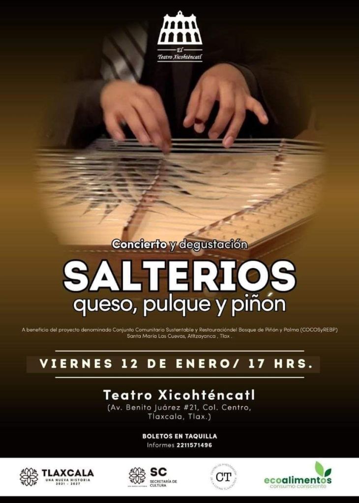 El Gobierno del Estado, a través de la Secretaría de Cultura (SC) y el Teatro Xicohténcatl invitan cordialmente al concierto y degustación llamado “Salterios, queso y pulque” donde habrá distintos grupos de Salterios del municipio de Atltzayanca, productores de “Las cuevas”, la degustación estará a cargo del “Centro de Investigación y de Cocina Tlaxcalteca” y “Grupo Instituto Superior de Ingeniería Mecánica Automotriz “(Isima), en su rama de gastronomía, los objetivos son recaudar fondos para el proyecto denominado Conjunto Comunitario Sustentable y Restauración del Bosque de Piñón y Palma (CocosyRebp) de aproximadamente 400 hectáreas, de las cuales 200 sufrieron un siniestro hace casi 5 años, lo recaudado servirá para su restauración, conservación y difusión.