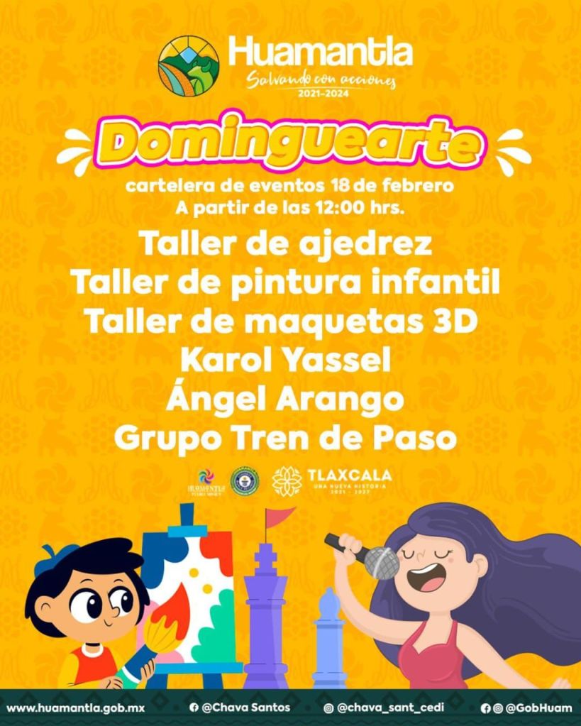 El H. Ayuntamiento de Huamantla, a través de la Coordinación de Cultura, invita a toda la ciudadanía a asistir al programa “Dominguearte”, que tiene lugar cada fin de semana en el Parque Juárez, donde se disfruta de diversas actividades artísticas y culturales en compañía de la familia.