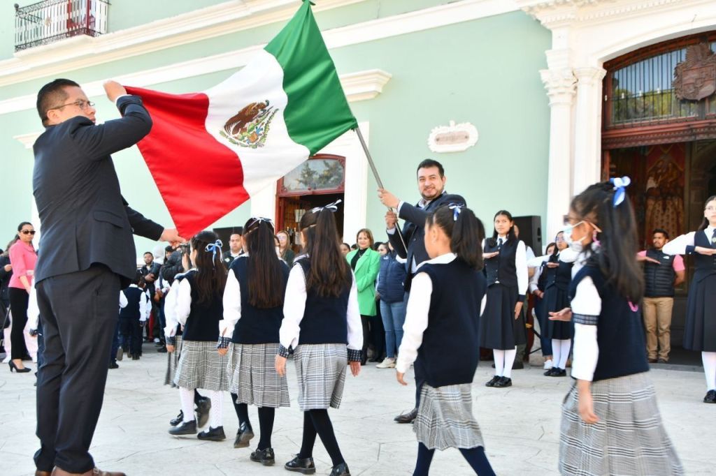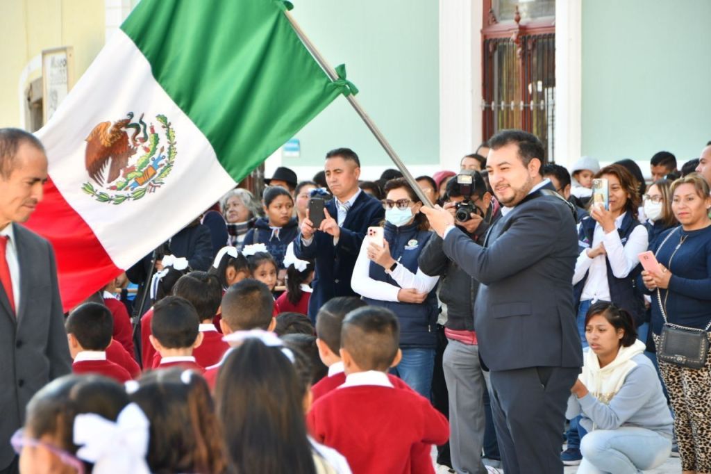 El Juramento a la Bandera fue realizado por el secretario del Ayuntamiento, Humberto Flores Martínez, a más de 500 alumnos de primer grado de Primaria de diversas instituciones educativas de Huamantla, quienes entonaron con orgullo el voto patriótico.
