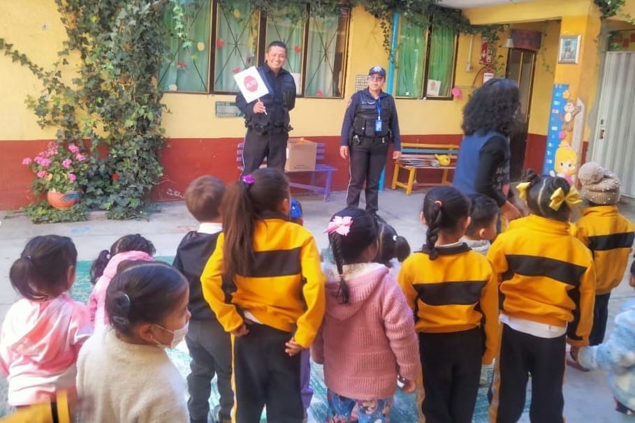 Personal del área de Proximidad Social de la Dirección de Seguridad Pública de Huamantla, impartió una plática y demostración sobre autocuidado y medidas de protección a infantes del Centro de Atención Infantil Comunitario (CAIC) “Sonrisa Infantil” del barrio de San Sebastián.