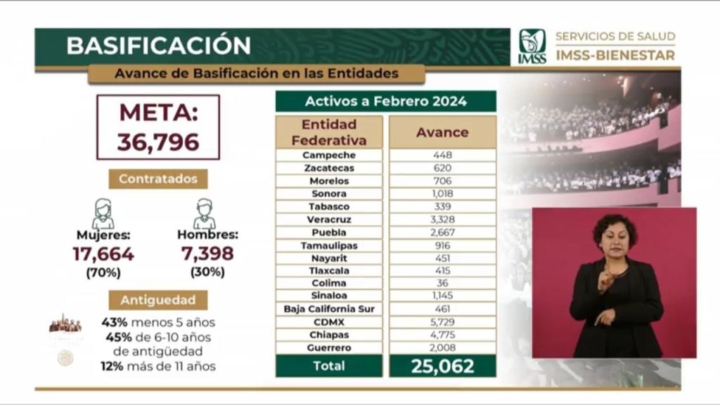 Respecto a la basificación del personal de salud, mencionó que se tiene una meta por alcanzar de 36 mil 796 basificados en los estados donde opera el IMSS-Bienestar, de los cuales, hasta el momento, se han basificado 25 mil 62 trabajadores de la salud en la primera etapa que realiza en el país.