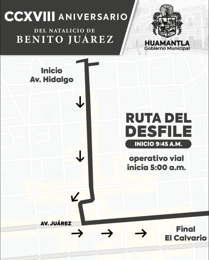 El H. Ayuntamiento de Huamantla a través de la Dirección de Seguridad Pública, informa que con motivo del desfile cívico-escolar del 218 aniversario del Natalicio de Benito Juárez, los lugares de estacionamiento de algunas vialidades del primer cuadro de la ciudad estarán cerradas, a partir de la 5:00 de la mañana.