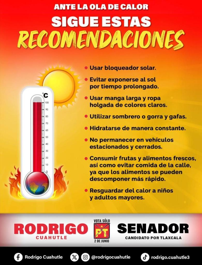 Ante las altas temperaturas que se presentan en la entidad, Rodrigo Cuahutle Salazar, candidato al senado de la república por el Partido del Trabajo, emitió una serie de recomendaciones a las y los tlaxcaltecas para evitar sufrir golpe de calor.