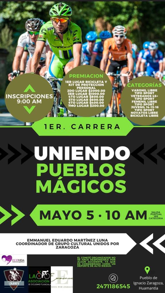 El Comité Cultural Unidos por Zaragoza, comunidad de Huamantla, convoca a la primer Carrera Ciclista “Uniendo Pueblos Mágicos” para el próximo 5 de mayo a las 10 horas, la cual comprende una competencia entre los municipios de Huamantla e Ixtenco, informó el coordinador de dicha organización juvenil, Eduardo Martínez Luna.