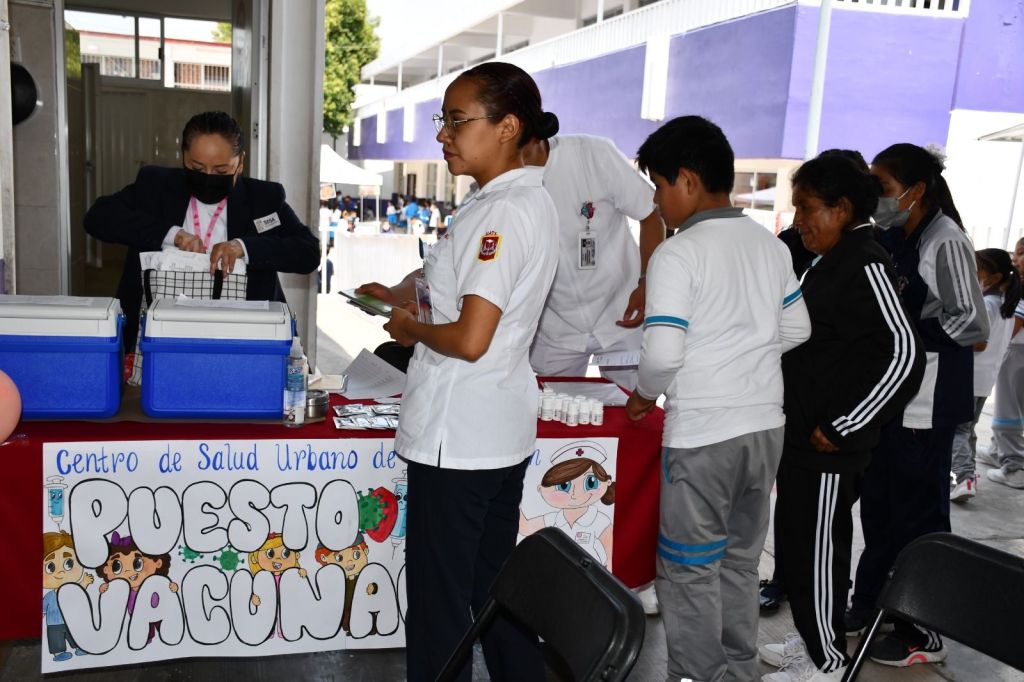 Con la presencia de alumnos, padres de familia y autoridades municipales, personal de salud invitó a padres de familia y a tutores a mantenerse informados, en coordinación con personal de educación, de los días de vacunación en las instituciones educativas de nivel básico.