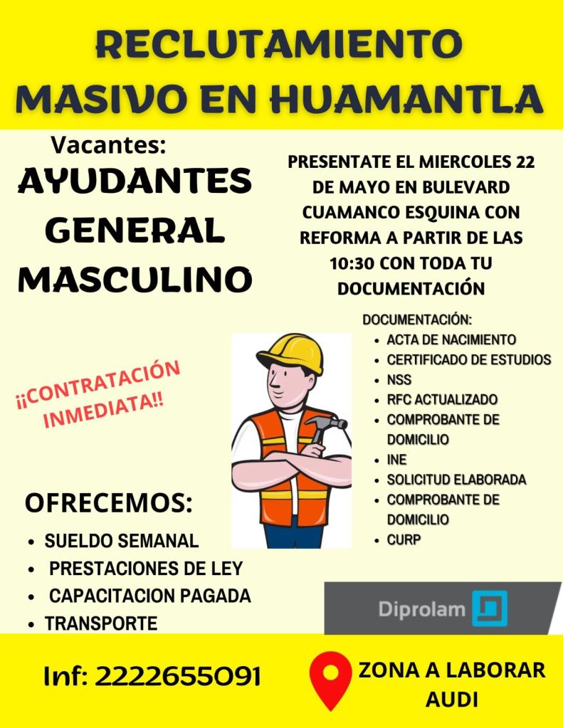 La empresa Diprolam especializada en el desarrollo y ejecución de ingeniería de punta en los sectores industrial, automotriz, comercial y de servicios, a través de la coordinación de Desarrollo Económico del gobierno municipal de Huamantla, invita a participar en la vacante de ayudantes generales del sexo masculino.