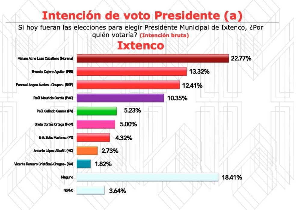 Aline Lazo Caballero, candidata a la Presidencia Municipal de Ixtenco, por morena, se ubica en el primer lugar de las preferencias electorales, datos que fueron publicados por la casa encuestadora “Impulso Mercadológico”.
