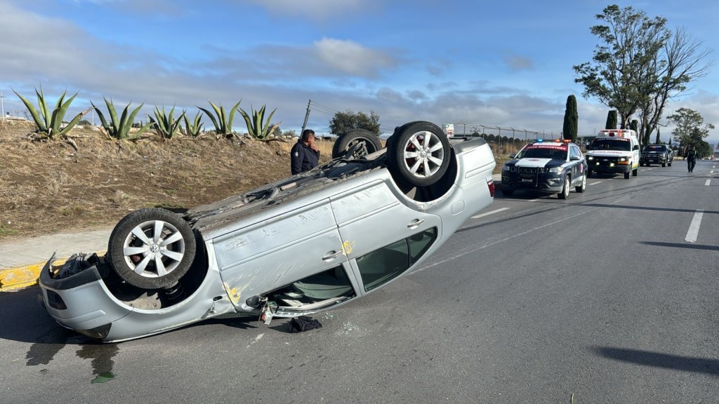 Esta mañana, la Dirección de Seguridad Pública de Huamantla respondió a un incidente de tránsito en el bulevar Juan Pablo II, donde un vehículo Volkswagen Jetta gris con placas de circulación XXX 918-C del estado de Tlaxcala volcó, ocasionando daños en el alumbrado público.