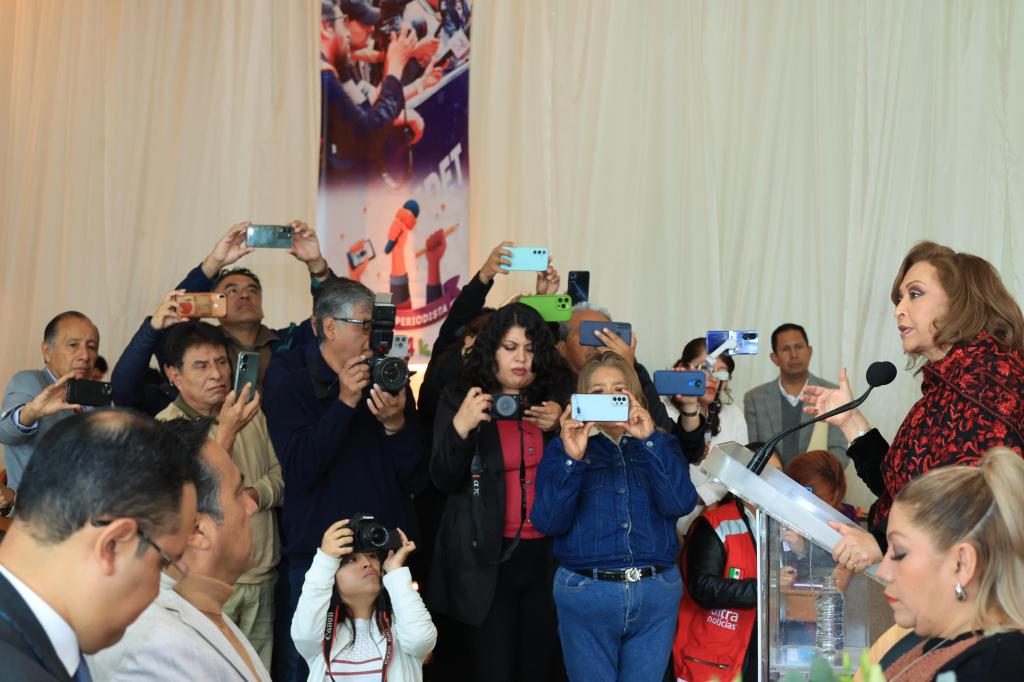 Acompañada por integrantes del gabinete de seguridad, Lorena Cuéllar reconoció la labor de quienes asumen con responsabilidad su alto compromiso de informar a la ciudadanía, privilegiando la verdad y la cercanía con la gente, pues recordó que “el buen periodismo solo puede surgir del corazón y de la conciencia social”.