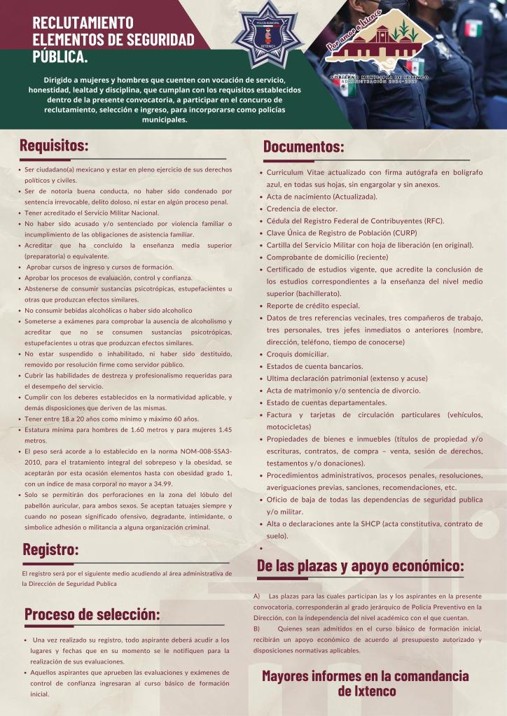 El Gobierno Municipal que encabeza Aline Lazo Caballero, a través de la Dirección de Seguridad Pública de Ixtenco, abrió la convocatoria para pertenecer a la fuerza policial de esta demarcación.