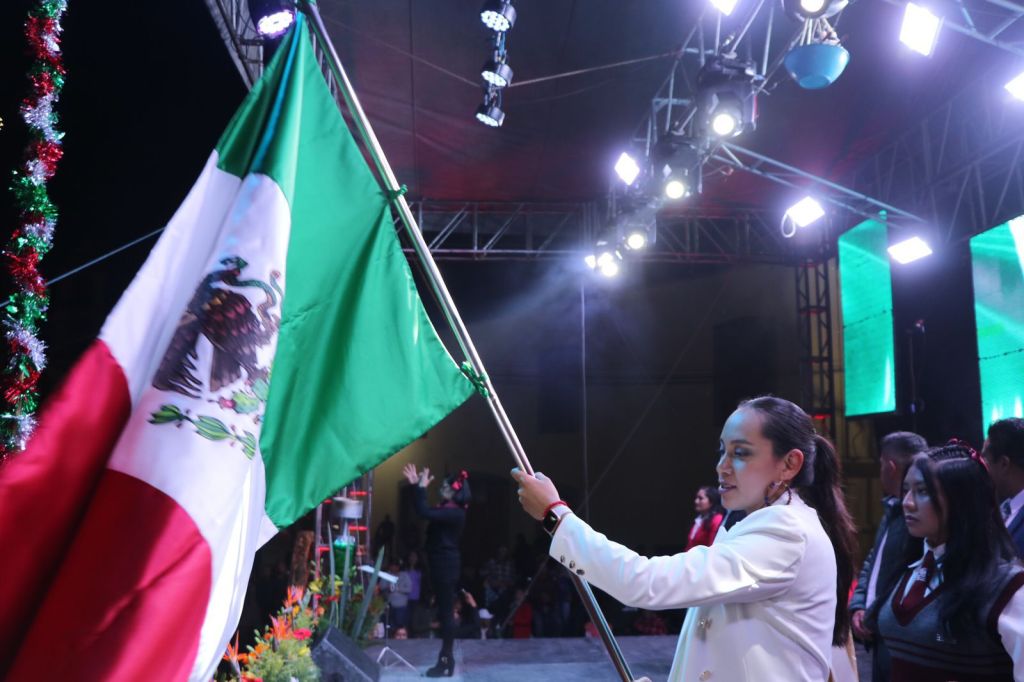 Desde el escenario ubicado a un costado de la presidencia municipal, Aline Lazo pronunció la tradicional arenga con orgullo, rindiendo homenaje a los héroes de la patria y destacando el valor de la mujer en la política.
