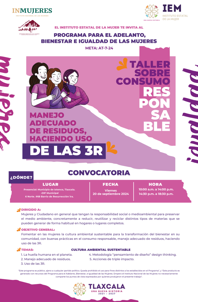 El Gobierno Municipal de Ixtenco, que encabeza Aline Lazo Caballero, en coordinación con el Instituto Estatal de la Mujer y el IMM de Ixtenco, invitan a mujeres y a la ciudadanía en general, a participar en el curso taller sobre consumo responsable, “manejo adecuado de residuos, haciendo uso de las 3 R”, que se llevará a cabo el próximo viernes 20 de septiembre en esta demarcación.